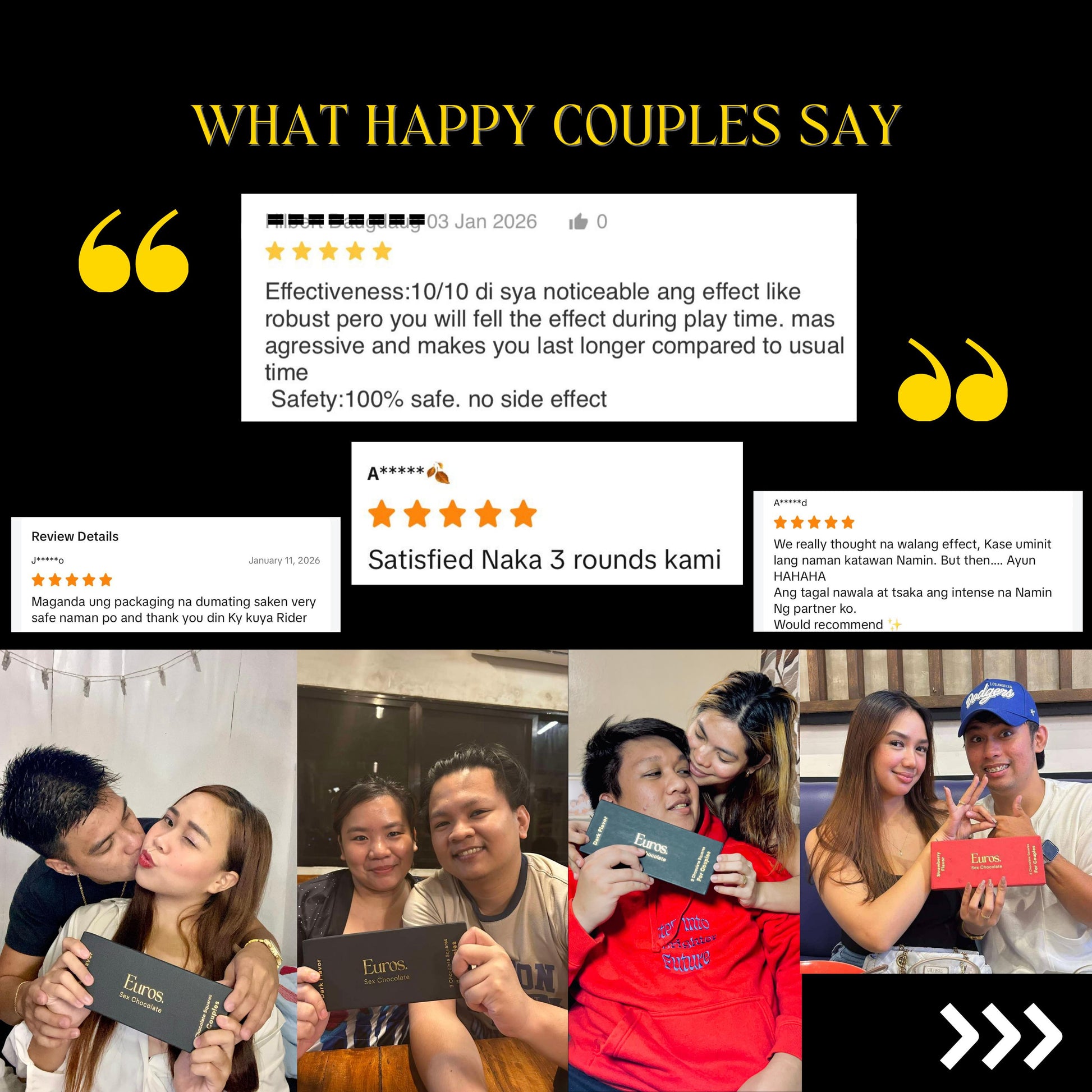 Please note that Euros is not like pills, enhancers, nor supplements. Euros Chocolate is made of entirely natural aphrodisiac ingredients that help promote bodily well-being and sexual appetite. They do not contain any harmful nor illegal substances and chemicals. Euros is a chocolate aphrodisiac and it’s all natural!