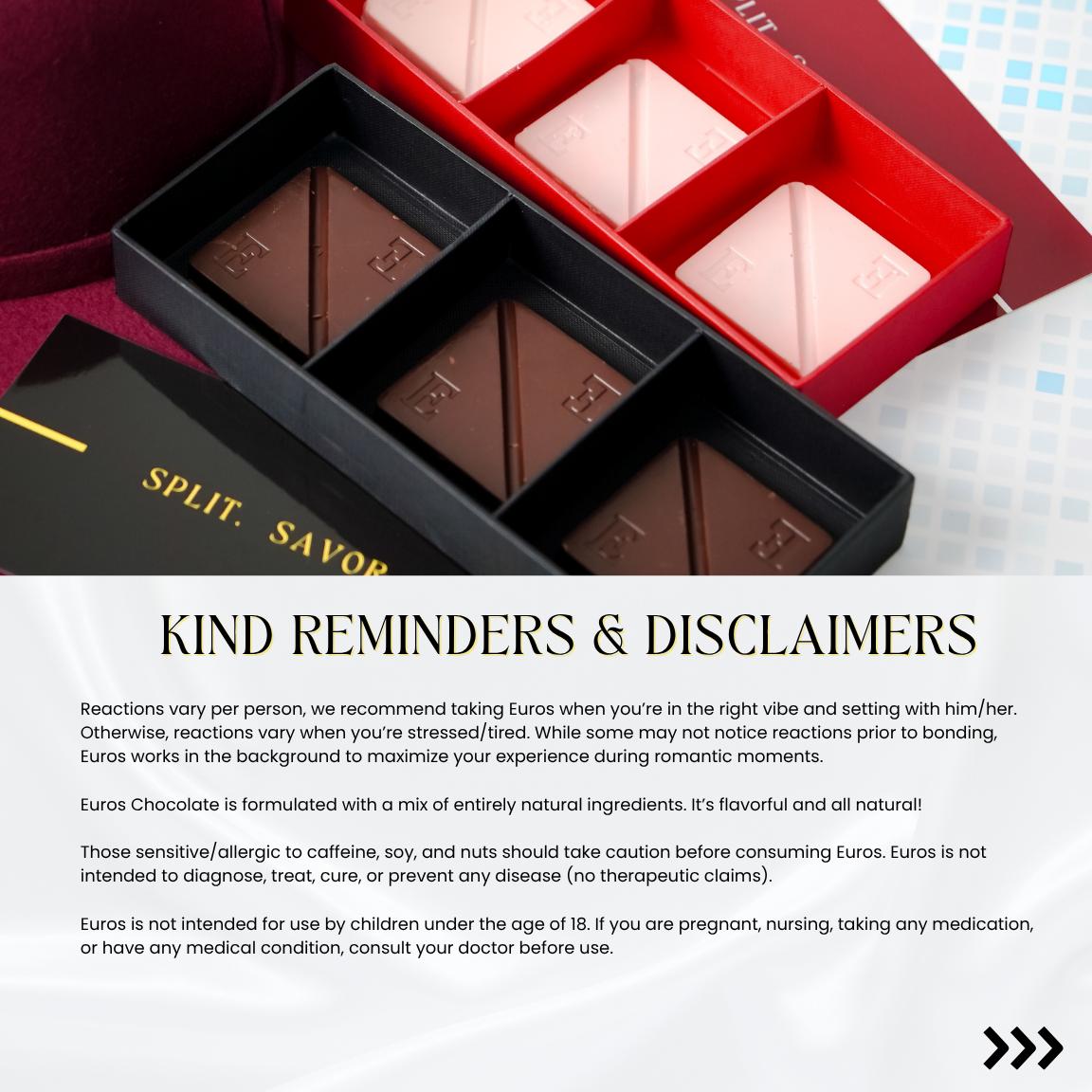 Reactions vary per person and we recommend taking Euros when you’re in the right vibe and setting with your partner. Otherwise, reactions may vary when you’re super stressed or tired. Please note that while some may not notice effects prior to intimate bonding, Euros Chocolate supports in the background to maximize your experience during romantic moments.