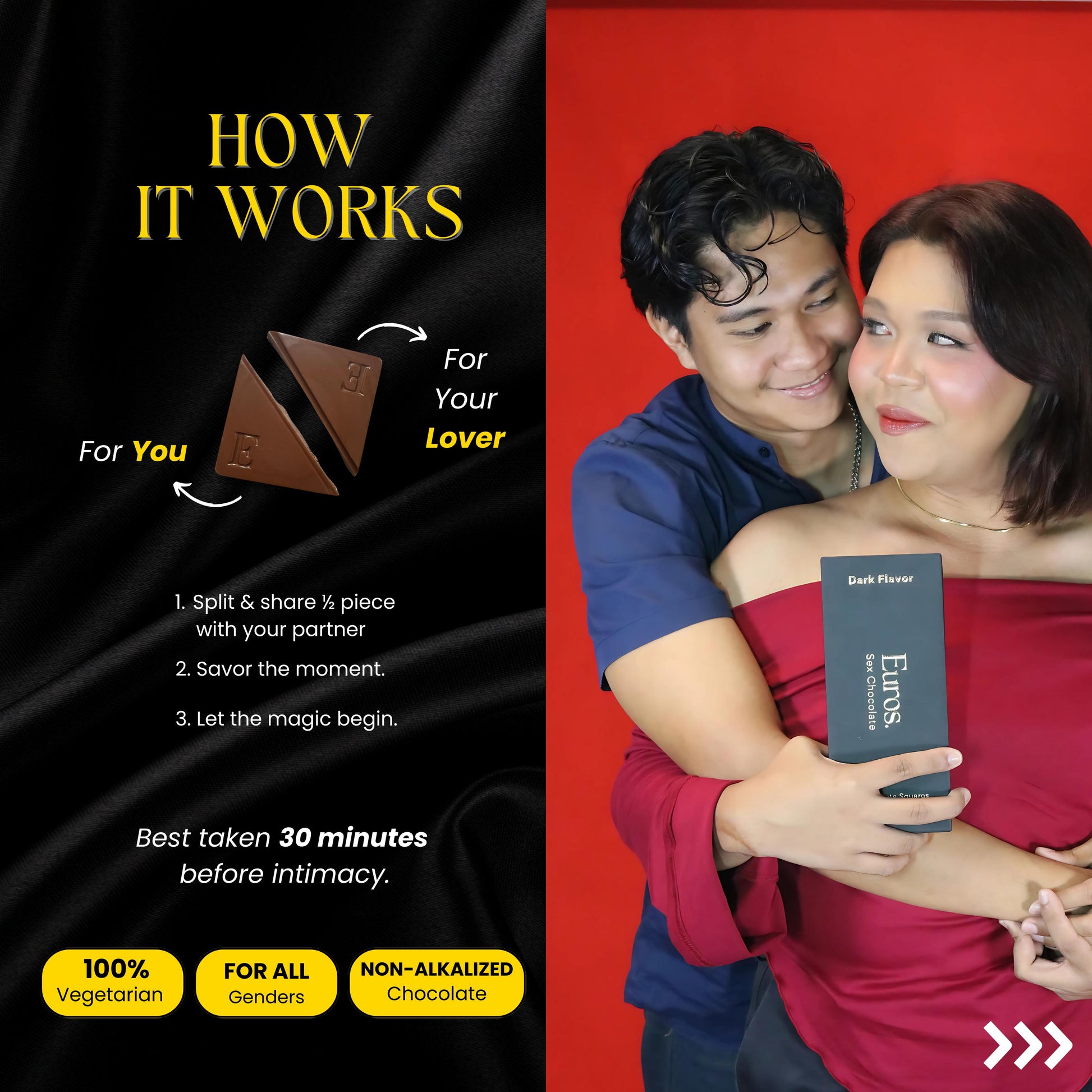 Simply split one chocolate in half & eat with your partner. We recommend taking Euros Chocolate with your partner at least 30 minutes before intimacy.