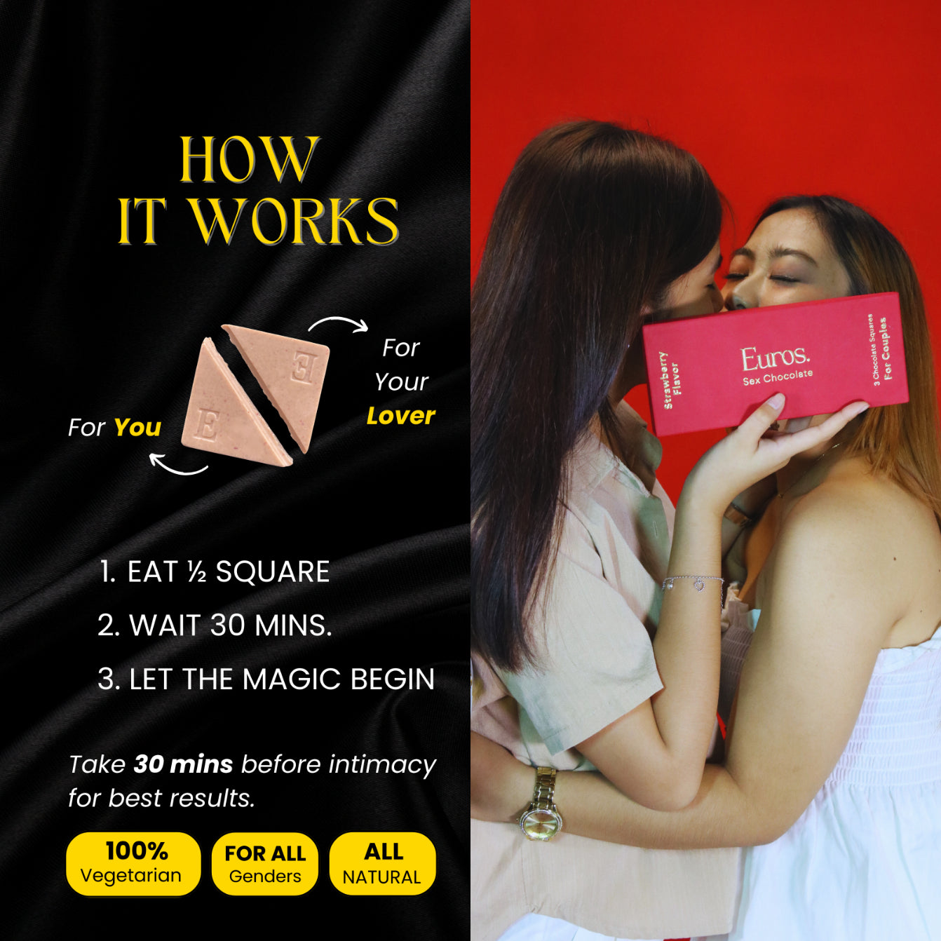 Simply split one chocolate in half & eat with your partner. We recommend taking Euros Chocolate with your partner at least 30 minutes before intimacy for best results. Please note that while some may not notice effects prior to sex, Euros Chocolate works in the background to maximize your experience during intercourse.
