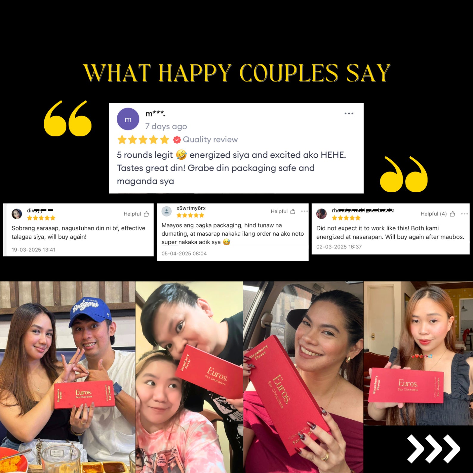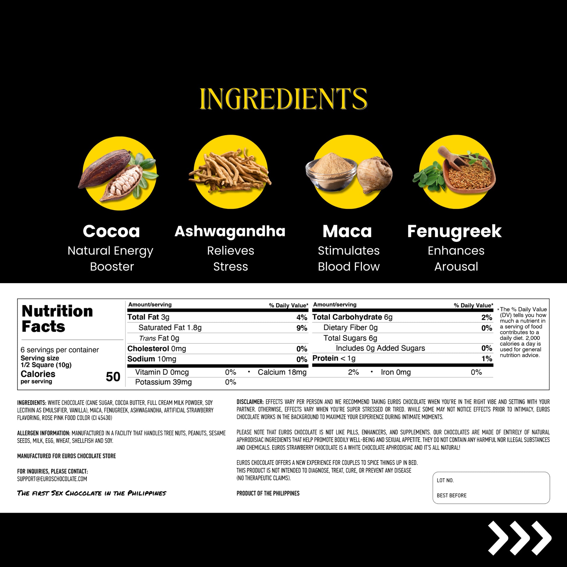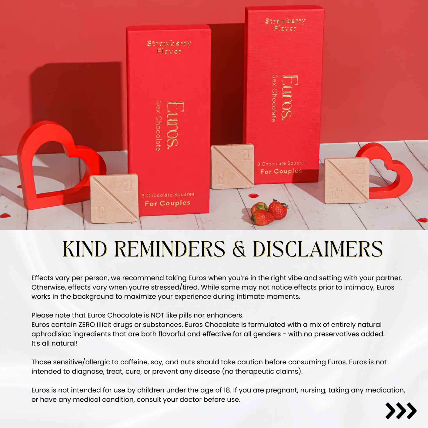 Please note that Euros is not like pills, enhancers, nor supplements. Euros Chocolate is made of entirely natural aphrodisiac ingredients that help promote bodily well-being and sexual appetite. They do not contain any harmful nor illegal substances and chemical. Euros is a chocolate aphroodisiac and it’s all natural!